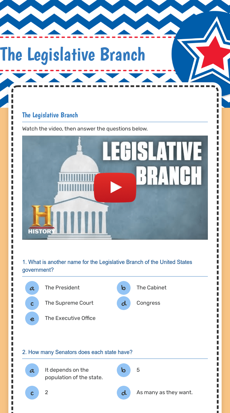 Web a huge free collection of worksheets and lessons that explore the branch of government that is in charge of making laws. The legislative branch of the u.s. Congress has two parts, the senate and the house of representatives. Web explore more about article i: Students will learn about the structure, function, and powers of the legislative branch of government.